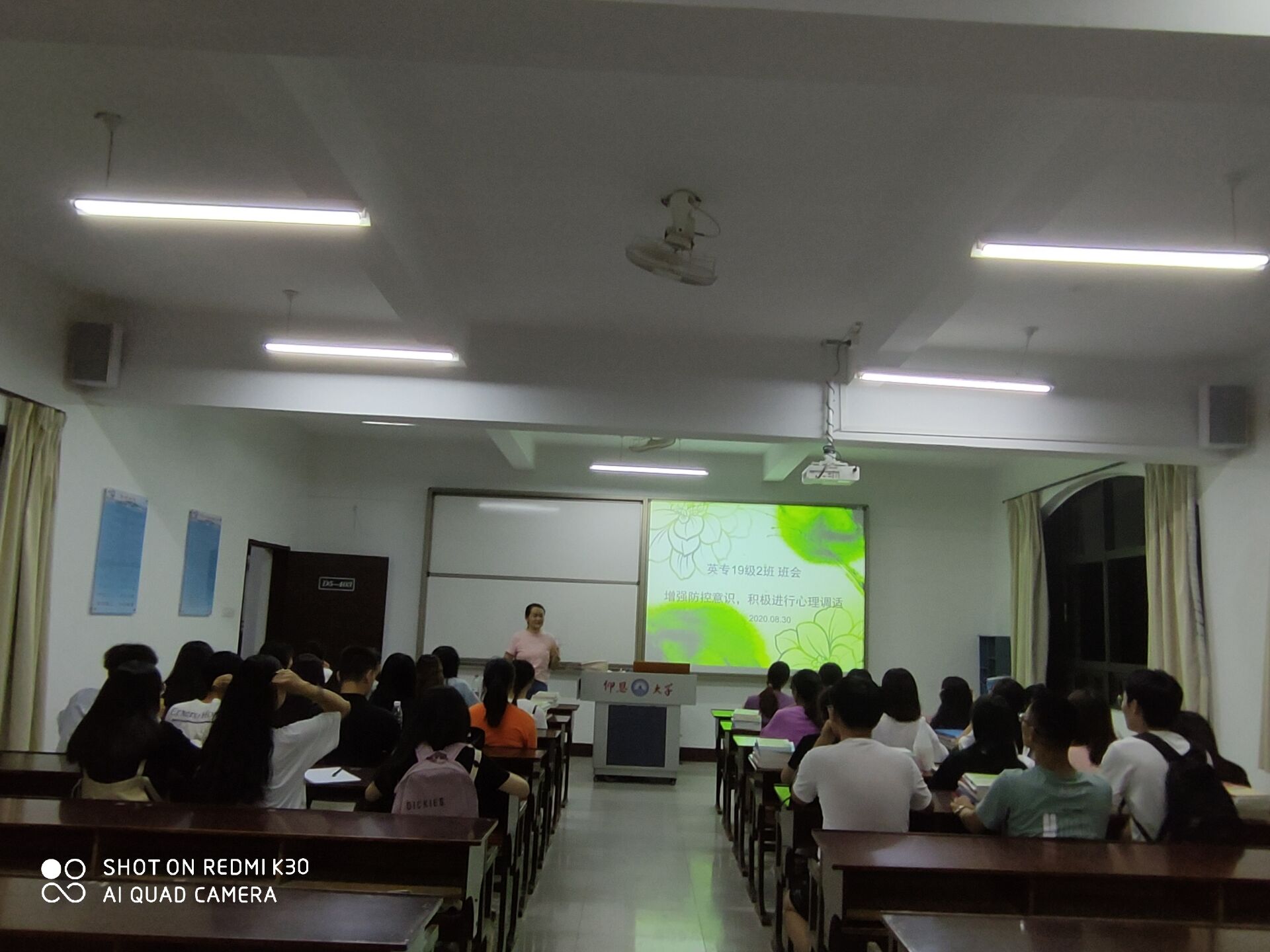 同一天晚上,18英语1班的全体同学相聚在了仰恩楼D4-405参加了新学期“开学第一课”。班会课上,班主任连毅卿老师第一次有关向同学们介绍了疫情以来大学生容易产生的心理健康问题以及作为大学生我们该如何去培养健康心态,如何去发泄负面情绪,以及学校对我们提供的心理咨询服务。老师同时也强调了特殊时期的特殊请假方式,疫情背景下启动线上请假销假的方式也更加方便了师生。