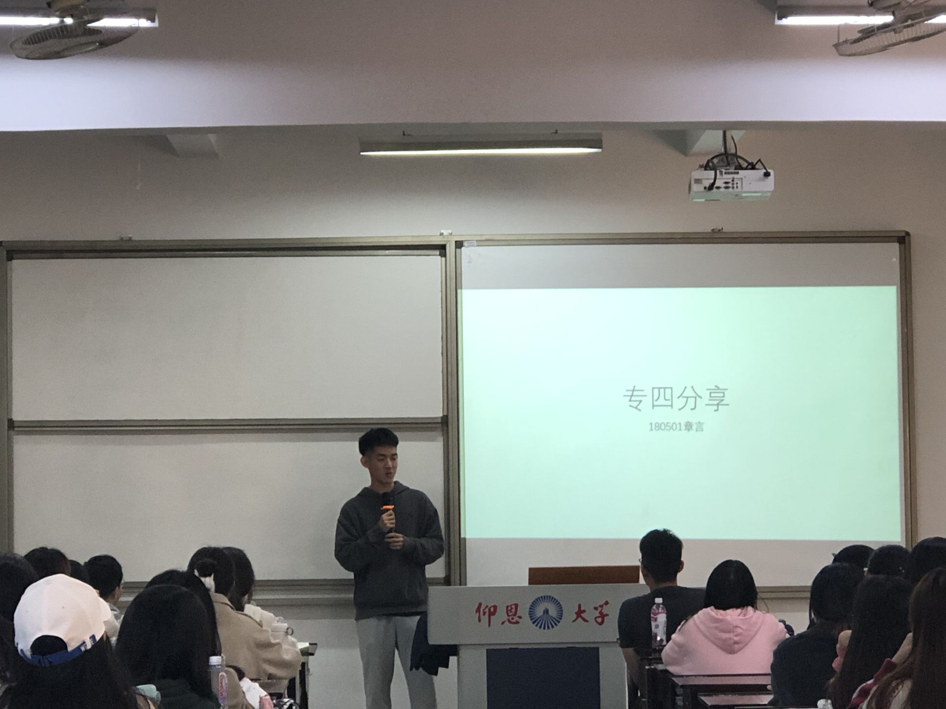 活动现场 郑林蕾同学在专八考试中取得了“优秀”的好成绩。她以一位大姐姐的身份和学弟学妹们分享了自己的经验和感受,除了细致的讲解专四每个部分的应试技巧以外,还特别强调保持良好心态的重要性。此外,林芷芬、章言、谢程航三位同学以真诚但不失幽默的风格与同学们进行面对面的深入沟通,他(她)们鼓励大家在学习上要勤奋踏实、持之以恒,寻找最佳搭档,相互勉励,共同进步,最后,他(她)们预祝学弟学妹们在明年的专四考试中取得优异的成绩!