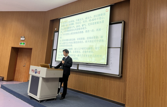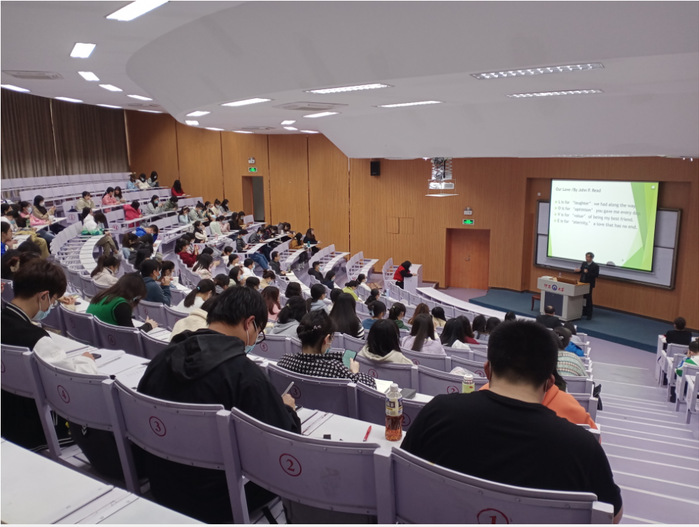 侯国金教授开篇以仰恩大学名称、童谣、闽南歌曲等学生耳熟能详的事物作为引子,设置悬念,循序渐进地导入翻译的语用性。然后他指出学习翻译和研究翻译时,我们要认真思考为什么翻译、翻译什么、如何翻译等“翻译三问”,这样才能培养翻译理论与实践的系统思维。同时他也强调翻译问题是语用翻译问题。在语用翻译学理论的指导下,他通过杨宪益夫妇、霍克斯翁婿翻译的《红楼梦来》的具体案例厘清了异化和归化的翻译方法,并且指明在做翻译研究时,切忌强行得出偏颇偏见的观点。在讲座中,侯教授展示了《语用翻译学:寓意言谈翻译研究的》其实也是语用翻译学的论题矩阵和宏图,并重点讲解语用翻译学的三大译观,即关联-顺应译观、构建主义译观、语言标记等效译观。他还强调在翻译研究中学理统辖译观,而译观又统辖译技。为了让在场的师生真正明白翻译的语用性,他展示了侯译童谣、诗歌以及声情并茂地演唱自己英译的闽南歌曲《爱拼才会赢》,让在场师生深刻体会到翻译语用性的新颖性和可行性:在翻译歌曲时,要注重所译歌曲的语义、韵律、诗学和可唱性,要学习为《英语世界》翻译歌曲的大师薛范。最后,侯教授对在场的师生提出语重心长的建议,他希望越来越多的年轻学者做真学术、做真学问,并加盟语用翻译学。在进行翻译研究中要以理论或问题(现象、语料)的“两驾马车”来驱动研究,在短时间内从一而终。他还说翻译研究行之有效的方法是界面研究或跨界研究,如语用翻译研究、修辞翻译研究、文论翻译研究、哲学翻译研究。