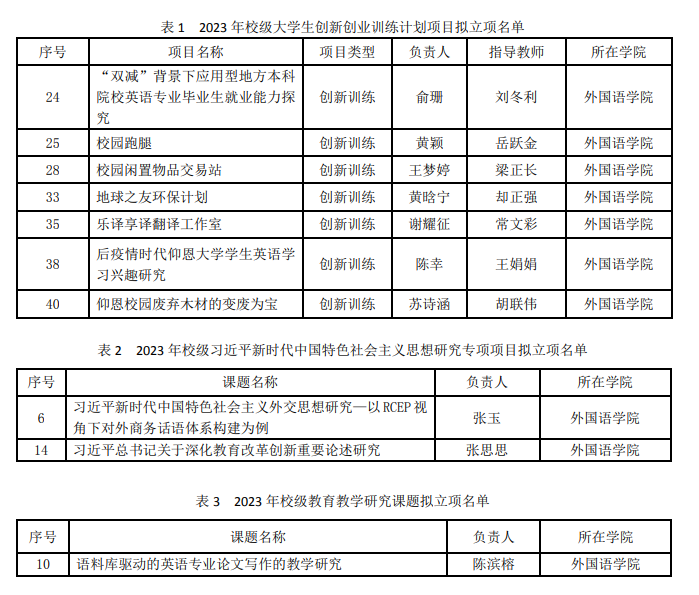 5月23日学校科研处公布了本学期校级大学生创新创业训练计划项目及各类校级科研、教研项目立项结果,在我院师生努力下,成果令人心喜!我院师生合作申报2023年校级大学生创新创业训练计划项目,成功立项7项(表1);我院张玉老师和张思思老师申报校级习近平新时代中国特色社会主义思想研究专项项目,成功立项(表2);我院陈滨榕老师申报2023年校级教育教学研究课题,成功立项(表3)!