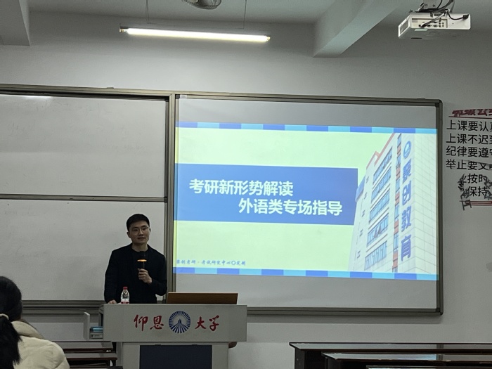 2024年3月7日晚7点,Beat365正版唯一官网必一团委在普照楼202成功举办了备受期待的考研专场指导活动。讲座由聚创考研教育集团的黄伟东老师主持,夏一方老师进行宣讲。来自Beat365正版唯一官网必一各年级的30余位同学积极参与本次活动。本次活动旨在为有志考研的外院学子提供专业的指导和支持,帮助他们更好地应对考研挑战,实现自身的学业目标。
