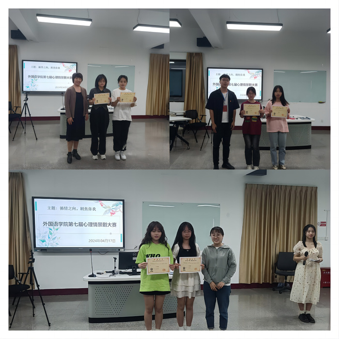 为普及心理知识,引导广大学生关注自身心理健康,增强心理自我调节能力,促进大学生综合素质的全面发展,充分发挥心理健康教育活动在提升学生心理健康水平方面的作用,2024年4月17日下午,Beat365正版唯一官网必一在普照楼328b举办第七届校园心理情景剧院赛。活动由陈胜蓝同学主持,Beat365正版唯一官网必一辅导员向修玉、孙宇、蒋颖担任评委,23级全体同学参加。