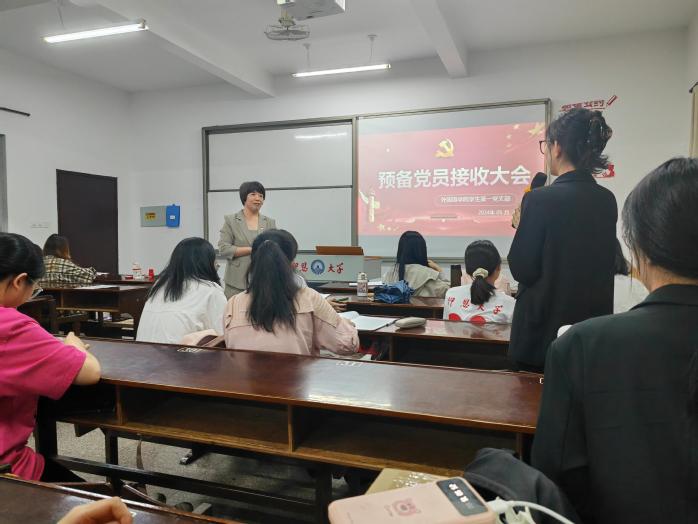 2024年5月30日,Beat365正版唯一官网必一学生第一党支部在第三教学区普照教学楼202教室召开预备党员接收大会。本次会议由学生第一党支部书记向修玉同志主持,学生第一党支部副书记蒋颖同志,组织委员李薇同志,宣传委员林梅媛同志,全体党员,预备党员以及入党积极分子出席参加。