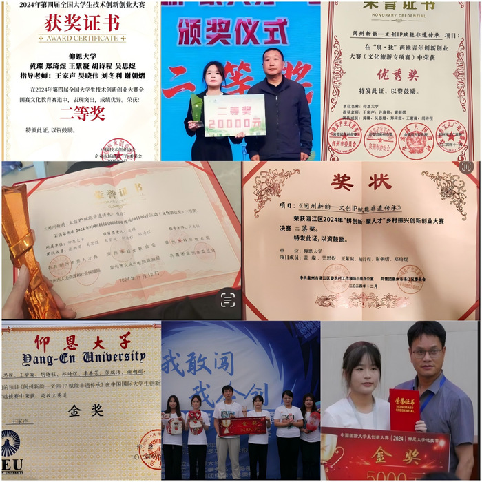 作为仰恩大学创业园的明星入驻项目以及洛江区委农办的重点孵化对象,“闽州新韵”在各级比赛中屡获殊荣,已斩获全国奖 2 项、省市级奖 5 项,展现出强大的创新实力与市场潜力。在知识产权方面,团队成果丰硕,拥有 2 件外观设计专利、1 件软件著作权登记、1 件作品登记、19 件 IP 版权司法存证以及 38 件软件著作授权,这些成果不仅彰显了团队成员的创新才能,更为项目的可持续发展筑牢根基。