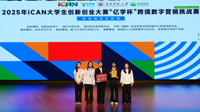 近日,2025年iCAN大学生创新创业大赛“亿学杯”跨境数字营销挑战赛(英语组)福建省选拔赛结果揭晓。由仰恩大学陈炜明、沈杨铃、庄然晰、杨杰锋、田芮嘉五名同学组成的“古港新思苑”队,凭借其出色的专业知识和创新思维,在比赛中表现优异,最终荣获福建省选拔赛三等奖。